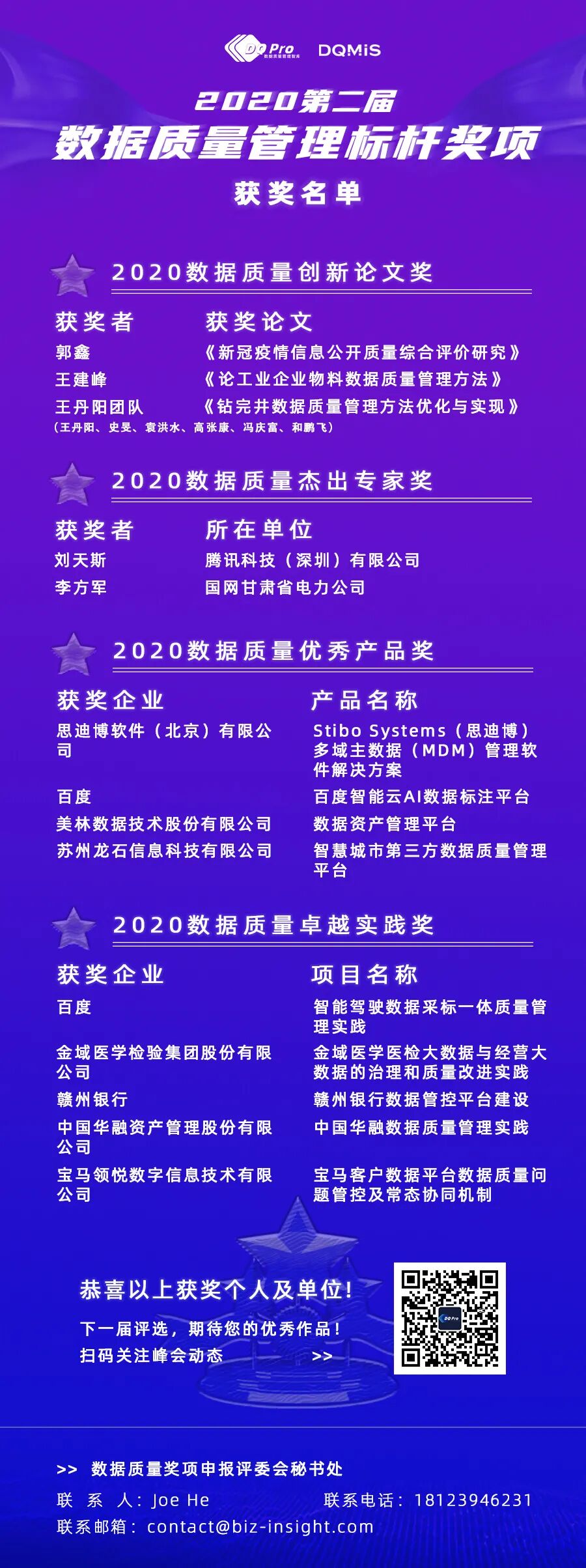9月10日,在2020第四届数据质量管理国际峰会现场,我们举办了第二届“数据质量管理标杆”奖项颁奖典礼,并为14个获奖个人及单位授予奖杯及获奖证书。