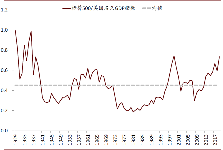 图表: 拉长时间来看,标普500指数与名义GDP之间的长期相对表现具有均值回归特征