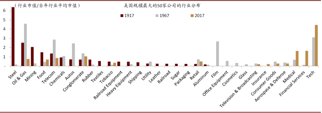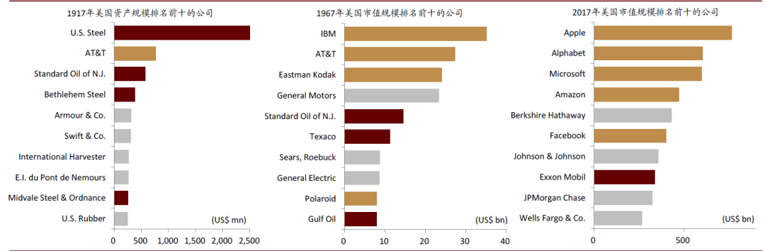 资料来源:Forbes,中金公司研究部 1917年用总资产规模衡量,1967年和2017年用总市值衡量