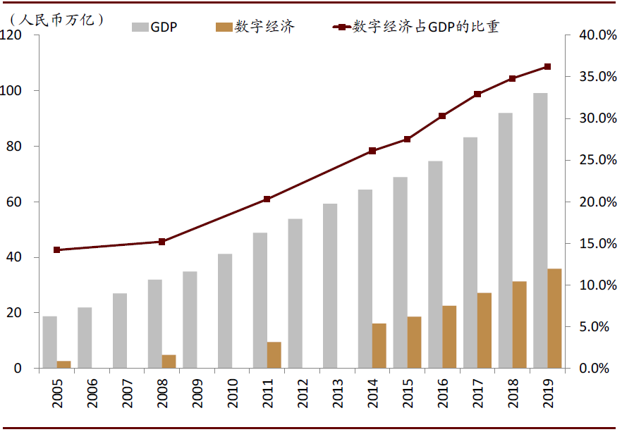 数字经济规模不断扩张,占GDP的比重达1/3。根据中国信息通信研究院《中国数字经济白皮书(2020年)》,2019年我国数字经济增加值的规模达到35.8万亿元,占GDP的比重达到36.2%,其中数字产业化占GDP比例为7.2%(包括电子信息制造业、软件行业、电信业、互联网行业),产业数字化占比为29.0%。与2005年相比,我国数字经济规模增长了12.7倍,年化复合增长率高达12.6%,占GDP的比例提升了22个百分点。数字经济已经成为推动国民经济稳定增长的核心动力。