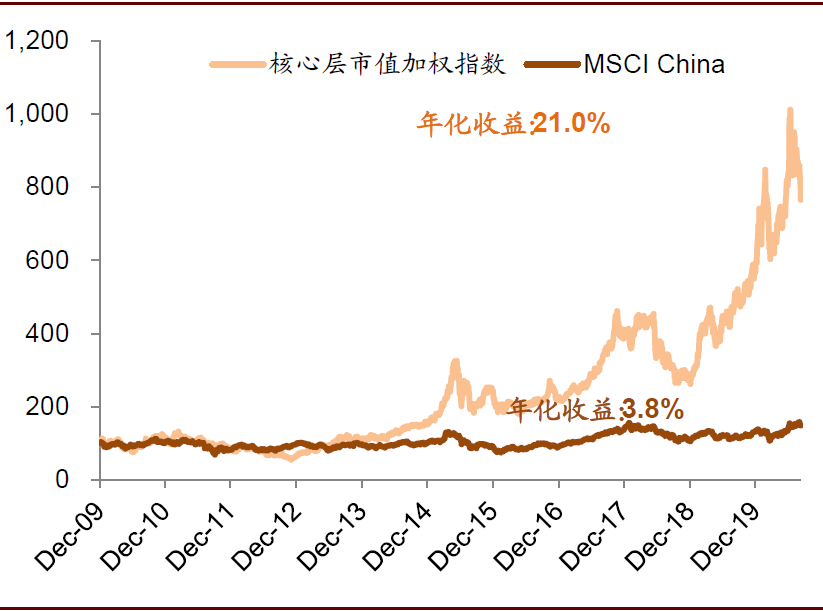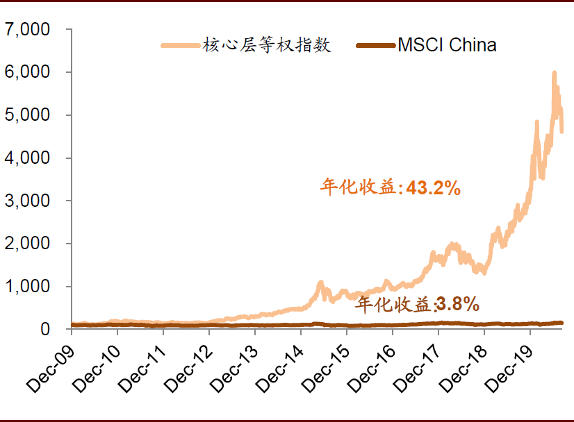 从投资的角度看,中国数字经济中处于核心层的科技公司也创造了非常辉煌的投资回报。但中国的科技公司中更多是利用中国大市场的优势在外围最底层的科技创新基础上推广科技应用、开拓应用场景类的公司。从最近十年的发展中,涌现出一批在中国科技应用领域具有相对核心地位的公司,包括华为、腾讯、阿里巴巴、美团、小米等等。但这些公司与美国等在半导体制造领域处于核心地位的“硬科技”公司,在科技的关键性上和不可替代性上依然有较大差距。