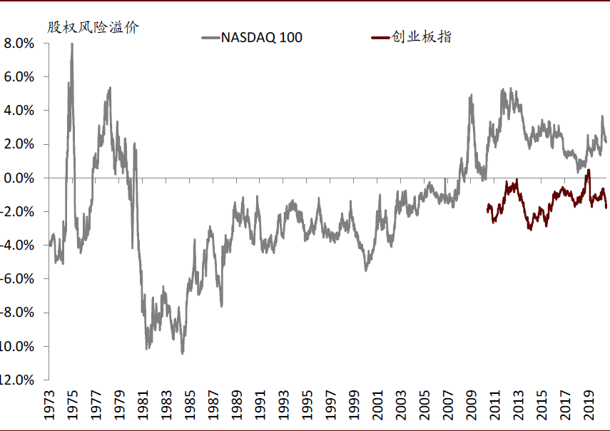 图表: 对于创业板指数和纳斯达克100的风险溢价,同期对比创业板指数更低,但相比2000年之前的纳斯达克100指数,创业板指数更高