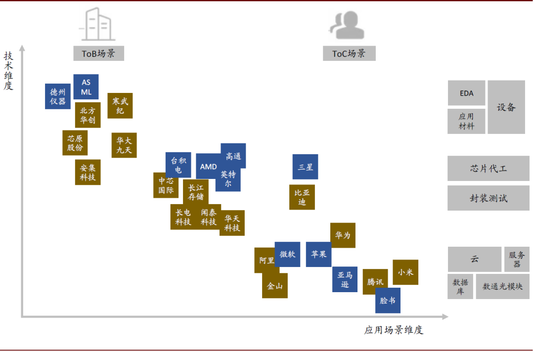技术维度理解核心层:理解核心层演进的一个维度是底层最基础的科技创新。这是沿着科技关键性及核心程度不断往底层技术追溯,如,从表层消费电子(如中国的小米,OPPO,VIVO),到芯片设计与制造(如高通、台积电等),到半导体设备与材料(如ASML、应用材料),等等。这个维度的科技创新是狭义的科技创新,是真正的“硬科技”维度的创新。这一维度的创新和进展,对科技行业都具有牵一发而动全身的影响,每一次这一维度的关键技术进步会带来整个科技发展的大跨步,比如芯片技术的迭代演进,比如半导体材料技术进步,从传统硅基半导体到量子计算的潜在演进等,都会对整个科技产业产生革命性的影响。