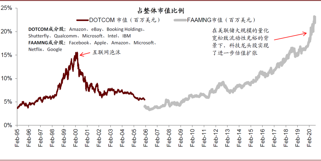 投资者对数字经济发展的热情及憧憬,在2000年左右的美国市场酝酿了一场举世瞩目的科技大泡沫。2020年至今全球最大两个市场美国及中国股市领涨全球,同时这两大市场内均是科技相关板块领涨市场,数字经济相关板块的市值占比已经达到近二十年的新高度。以美国市场为例,科技龙头股(FAAMNG)合计的市值已经达到7.1万亿美元,占美国股市的市值比例接近23%,已经远超过了2000年互联网泡沫的顶点水平。