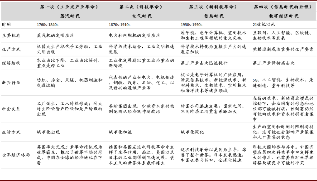 图表: 当前数字科技革命与历史上三次科技革命主要特征及对比