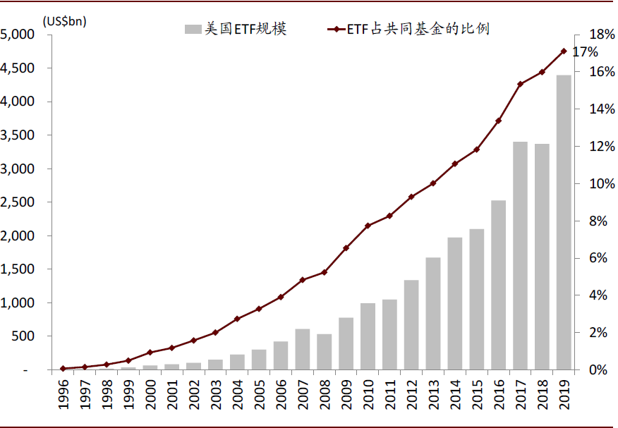 图表: 2019年底,美国共同基金结构:ETF占比17%