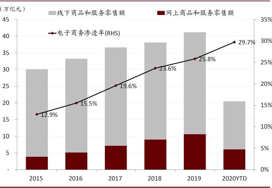 图表: 中国电子商务发展较早、增速较快,但占总体零售的比例依然只有30%左右