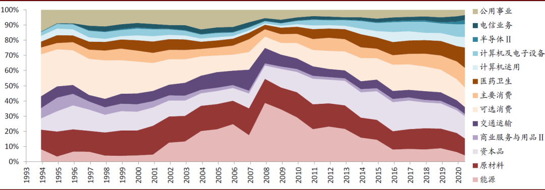 图表: 美国股市长期的行业格局演变:美国股市行业结构1800-2018