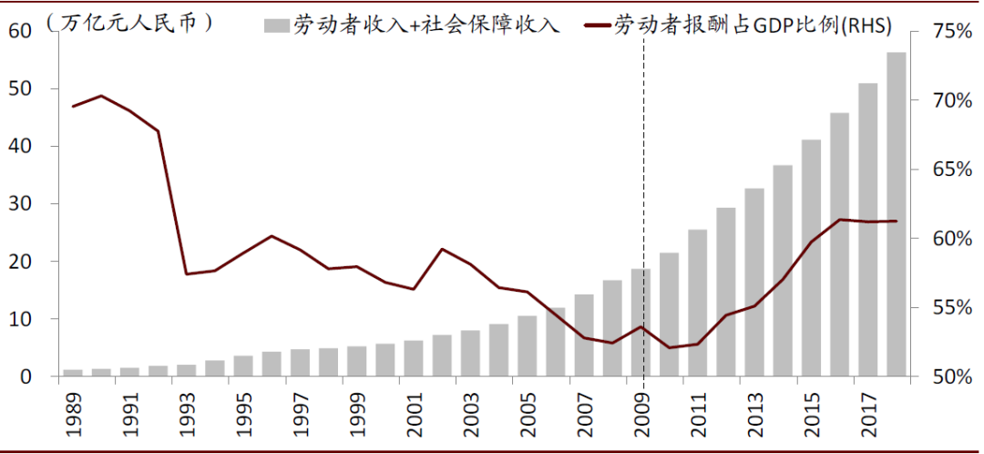 图表:中国近10年劳动者收入占GDP比例份额有所扩大