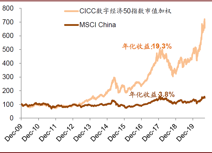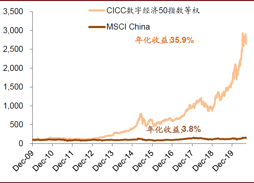 板块及指数化投资可能相对更容易分享到数字经济发展的投资红利。由于数字经济的网络效应、规模效应、范围经济、非竞争性等特征,数字经济浪潮带来的改变急速且剧烈,个别公司面临的不确定性可能更大。比如,在数字经济发展之前,传统行业界限相对较为明晰,行业内的现有玩家能相对清晰地了解自己的竞争对手。但数字经济的发展,模糊了行业和领域边界,常常会出现领域外的公司很快颠覆某一行业内地位较强的公司的情况。比如,与公募基金几乎没有关联的科技公司赋能天弘基金,使得天弘基金一度一跃而成公募基金行业内资产规模最大的公募基金公司。家电零售业,一度出现苏宁和国美等两家传统家电零售巨头的激烈竞争,但京东等新零售公司的出现,颠覆性地改变了行业格局、加速了传统家电零售地位的下降,等等。基于这一特征,数字经济领域的投资,可能更适合用相对分散化的板块或指数投资,而非对单家公司下注。因此,我们编制了中金中国数字经济50指数,便于投资者梳理中国数字经济发展带来的机遇。