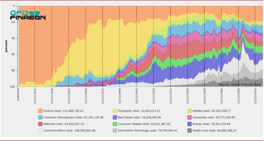 这到底是乐观者所认为的对“未来已来”的预示,还是悲观者所嗤之以鼻的“大泡沫”?在本章中基于历次科技革命及本次数字经济发展的分析,并基于Global Financial Data中的美国股市行业市值[1]占比变迁的数据,为理解当前数字经济发展及其在股市的反映提供一些思路。