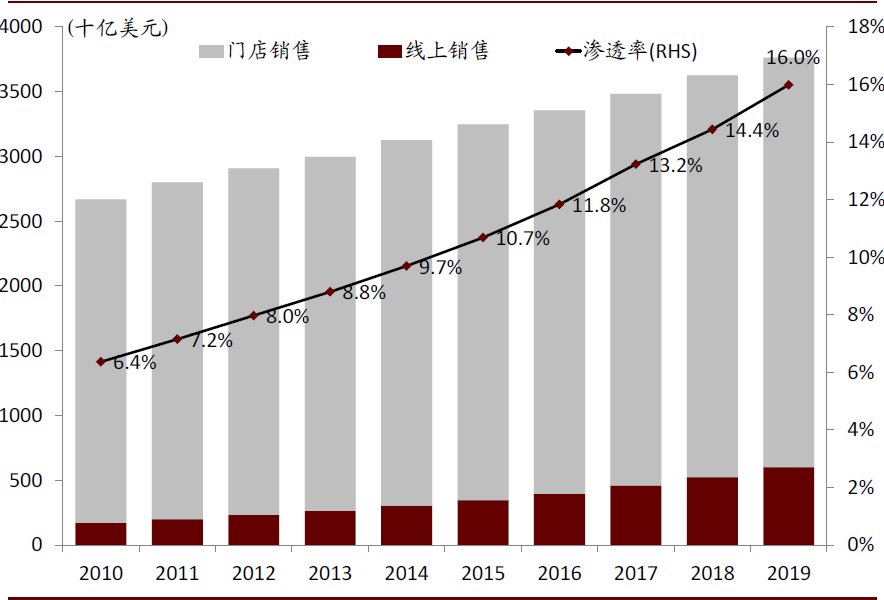 图表: 当前,美国电子商务的渗透率还不到20%,也依然有较大的空间