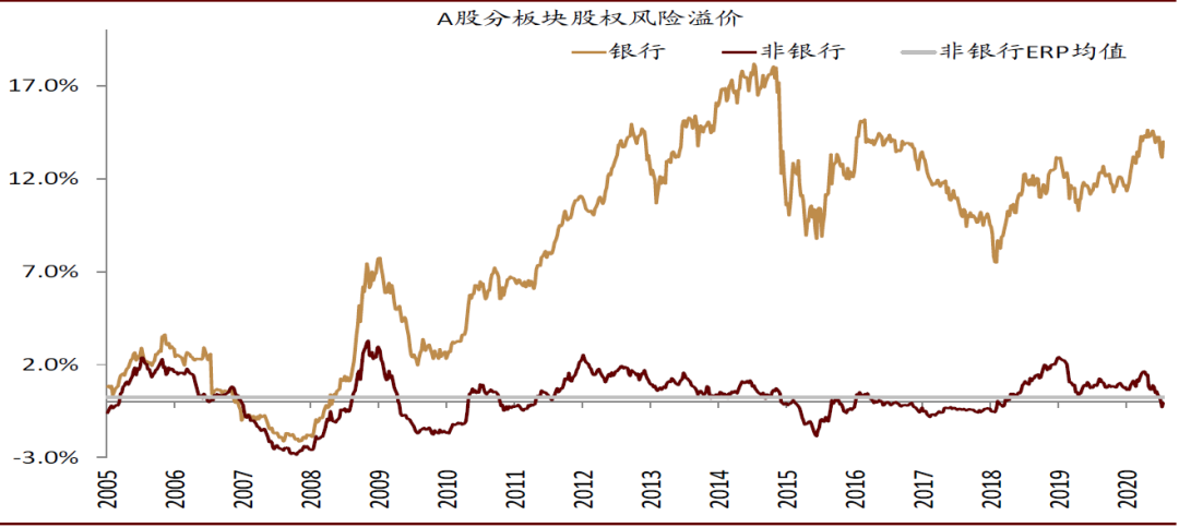 某一资产、某一行业的风险溢价是基于对风险敞口和风险事件发生概率的判断,历史经验和数据分析有助做出判断。例如从A股历史数据来看,ERP在2012年前后存在中枢的上移,如果把A股市场分解为非银行板块和银行板块分别来看,非银行板块的ERP基本在围绕中枢上下波动,而银行板块的ERP在2012年前后的中枢有上移,反映的可能是投资者对银行潜在坏账风险的重估。