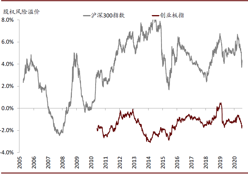图表: 在A股市场上对比沪深300指数和创业板指数的风险溢价,创业板指数的风险溢价更低