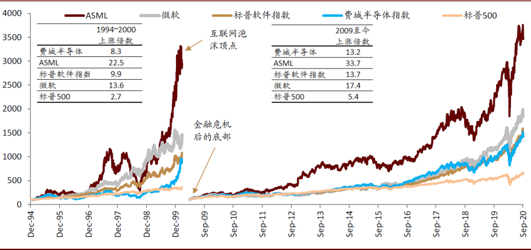 从股票投资的角度看,技术维度核心的公司(“不可替代性”),以及应用场景创新上能够把握最多客户、满足最稳定的客户需求的公司,这两类公司展现出最大的投资价值。举例来说,半导体是数字经济核心层硬件中的核心。反映美国半导体行业的费城半导体指数,在1994年至科技泡沫顶点(2020年6月底),上涨幅度达到了8.3倍,2008年底部至今,移动互联网大发展推动费城半导体指数上涨超过10倍,而在半导体公司中处于核心的半导体设备及材料类公司,同期涨幅更大,如半导体设备中处于最核心地位ASML同期上涨则超过30倍。美国的微软公司也是数字经济核心层最重要的公司之一,在PC时代提供操作系统及相关应用,如办公软件,在云计算时代提供云服务。微软在2000年科技泡沫时期就是最核心的公司,在最近移动互联网时代一度落后,近几年又通过持续的技术演进及路线迭代,重新回到数字经济的核心层,股价自2009年以来上涨也超过10倍。
