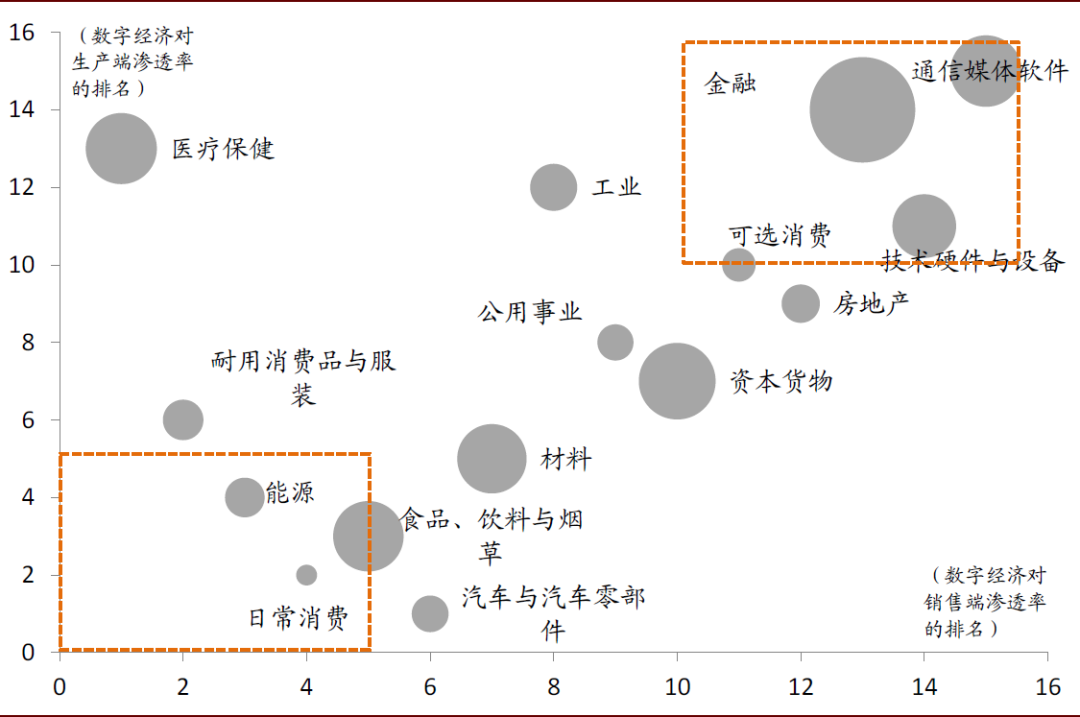 能够实现数字经济融合的产业在供给和需求方面有两大共性:1)供应层面:原本生产效率有待提高或者生产销售环节冗长,数字化能够提高各个生产环节的效率或减少不必要的中间环节。例如,流程自动化、渠道扁平化、供应链实时管理等。2)需求层面:拥有大规模的客户量、高频次的需求,能够积累海量数据应用大数定理进行分析,并且可以通过互联网触达更多客户,实现线上流量向线下客户的转化。