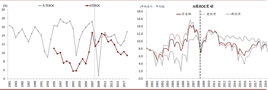 图表: 美近十年上市公司ROE优于中国(左),中国上市非金融类公司ROE出现“新、老分化”(右)