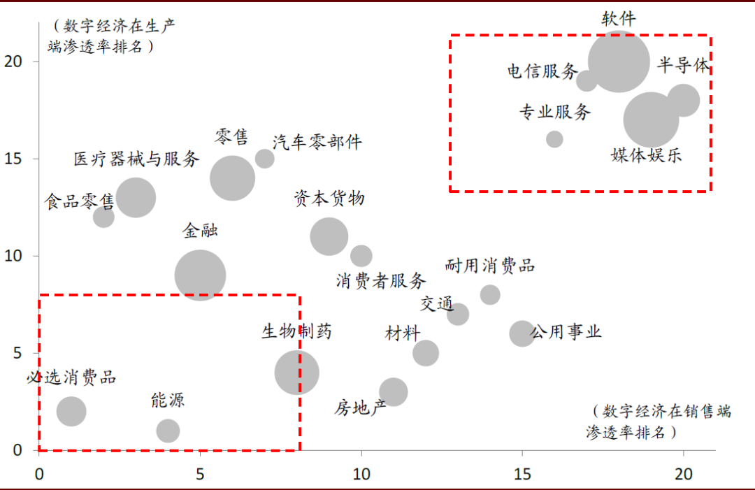 从上面的分析和定义可以看到,核心层的硬件及软件行业是数字经济的基础;应用及平台层是在核心层硬件和软件支持下形成的,是数字经济形态发挥作用的关键;数字经济与各垂直应用领域相结合是数字经济赋能的体现,是最表层的、容易直观感受到的。到目前为止,各行业与数字经济的关联度有较大差异。