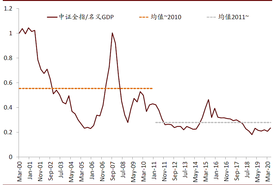 图表:拉长时间来看,中证全指与名义GDP之间的存在均值回归特征。不过2011年前后,中枢发生了切换