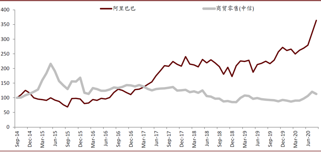 图表: 电商平台阿里巴巴的股价大涨,但与此同时传统商贸零售指数表现相对低迷