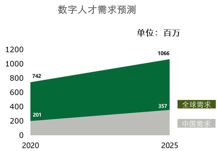 无论在全球还是在中国,数字化经济爆发式增长带来了数字化人才需求量急速增长。预计到2025年,产业数字化进程需海量数字化领袖、业务与技术人才,如下图所示: