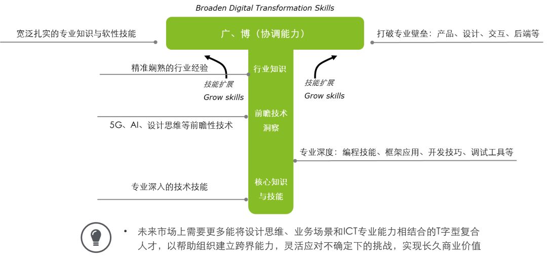 数字化转型需要的不仅仅是技术类人才,未来市场上需要更多能将设计思维、业务场景和ICT专业能力相结合的T字型复合人才,尤其是在垂直行业领域深度应用最新的数字化技术的跨界人才。他们既需要掌握数字化思维,又需要精通本行业内的商业运作模式和流程。