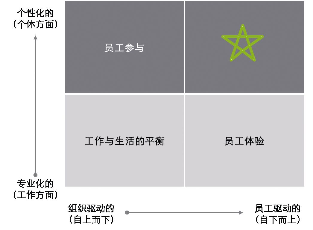 这不仅仅是一种自上而下的体验尝试—员工感受不到自己是体验设计的主体,而是在最大程度上基于员工已有的职业发展诉求进行设计(自下而上),并聚焦于个人体验(个性化),使员工能够以适合他们的方式把工作做到最好。这两者的交汇处正是最佳体验点,如下图所示: