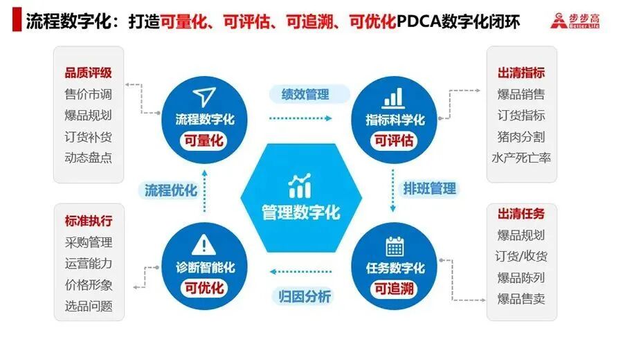 第二,提高现有业务流程的数字化。步步高有一万多员工在卖场工作,过去是很难进行管理监督的,全面数字化后目标就是要打造可量化、可评估、可追溯、可优化的PDCA(Plan-计划、Do-执行、Check-检查、Action-处理)数字化闭环,将现有流程、指标、任务全面数字化,实现员工责任和绩效可追溯,最后基于以上数据做归因分析,进行诊断和优化。