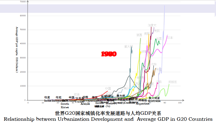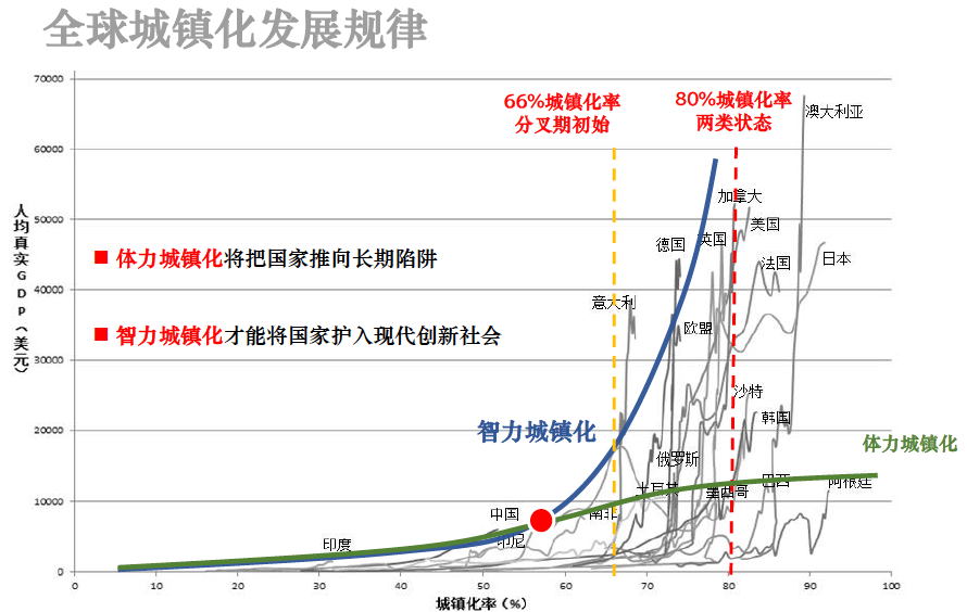 我们团队一直跟踪全球所有的城镇化,研究全球城镇化规律,从以下图看出德国、英国、美国是非常有规律的,只是我们过去是不确定的,主要凭感觉。所有发展中国家都在下面,包括阿根廷、巴西、俄罗斯、土耳其、南非、中国、印尼、印度,随着城镇化的发展,他们是第一条线,一条底线就是从农民变成城市,全世界统计下来这条线是非常清楚的,人均产出发生三倍的提升。发达国家第二次城镇化在66—80%的时候,突然之间转型,不再往下走,而是提升劳动生产力。比如意大利,到66%时就转掉了,国家留了30%的人,66%的人是在城市的,然后生产提高到人均GDP为4万。英国、美国是80%,非常清楚。只有15年时间要转型,剩下的国家再往前走的,其实都是到村里面去了。看得非常清楚,这是我们统计的一条规律。