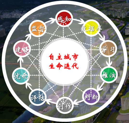 一是自主城市全生命周期的全智化。这是我们过去的建设模式,先是创作方案,然后专家评估,接着优化以后就开始建设。实际上开始大规模上面的5个步骤,从感知到数库,然后到学习再到推演,看城市自身会怎么生长,然后再到判断有哪些东西是多余的、不需要做的,可以判断只是那些致命的弱点才要进行干预,干预以后才是创作,这个传统的四段,后面还有三段,做完以后还要监督、不断迭代,再回到感知,这是一个不断改、不断迭代的全生命周期。从4点变成现在这里的6点、7点、8点、9点,以后这个12点从整个盘面全部起来,这就是第一点的判断。