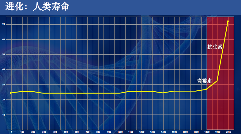 人类的人均寿命会大幅度提升,以下是瑞典皇家工程院在庆祝100年的时候做的一条线,这条线说明什么?人类这种动物一直是25岁的动物,一直到1800年到1900年现代化开始以后,人类才从25岁动物变成了45岁动物,又用1900年到2000年这么长的时间,人类才从45岁的动物变成了70多岁。瑞典皇家工程院百年大典上就说明人类现在用100年提升到45岁,然后100年提升到70多岁,现在再过100年,人类活在什么点上?为什么过去提升那么多?这200年正是因为我们人类发现了抗生素,因为抗生素的诞生,人类大规模提升它的作用,最后一个抗生素是1985年发现的,从1985年到2015年已经35年了,我们人类没有发现一个抗生素,就意味着人类对新型的病毒、超级的细菌没有特别手段。假如一旦新的病毒和细菌来的话,我们人类都会用老工具应对。这是非常厉害、准确的判断。