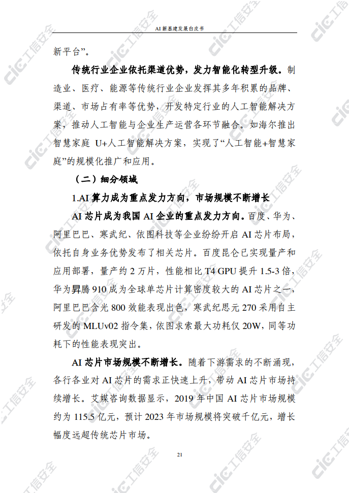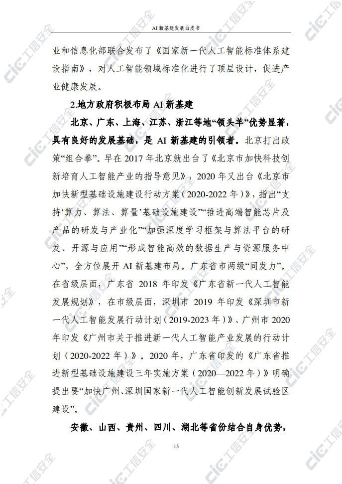 白皮书指出,AI新基建主要由AI算力、AI数据、AI算法及AI应用解决方案四部分构成,具有两方面作用,一是为人工智能发展提供内生动力,通过AI算力、AI数据、AI算法等基础设施发挥平台支撑作用,支撑人工智能自身持续创新发展;二是依托人工智能实现外部赋能,通过提供AI应用解决方案赋能实体经济各领域,推动传统行业信息化、数字化、智能化转型升级。在各级政府、行业企业、资本市场、科研机构的合力推动下,我国AI新基建呈现蓬勃发展态势。