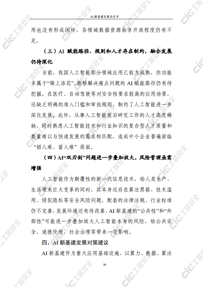 白皮书建议,为应对我国AI新基建在技术、数据、融合、安全等方面面临的挑战,应加快核心技术攻关、推动应用深化落地、构建公共服务平台、加强安全风险管理,进一步发挥AI新基建的技术赋能作用和公共基础作用,驱动产业转型升级、助力经济高质量发展。