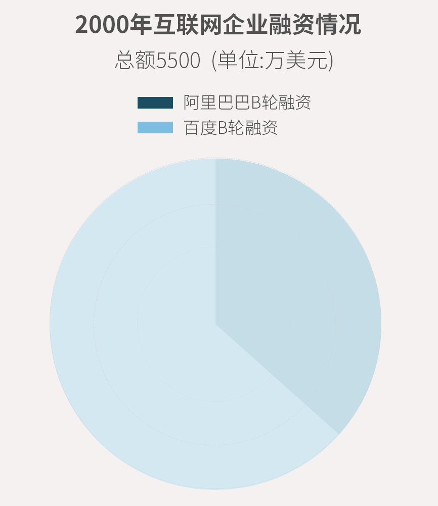 本世纪初还是门户为王的时代,电商、搜索、社交网络刚刚起步,但嗅觉敏锐的资本已开始大举进入。2000年,阿里巴巴和百度各获得B轮融资2000万美元和1000万美元,根据第三方数据商IT桔子的数据,当年可统计的互联网企业融资总额4517万美元,两家公司相加占比54.5%。