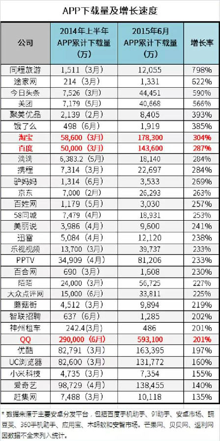 可以看出,BAT凭借其强大的品牌和渠道,移动端产品获得了快速增长,但一些新兴公司拥有了非同寻常的爆发力。最近一年中,同程旅游、途家网、今日头条、美团、聚美优品、饿了么的下载量增长速度,超过了BAT的产品。速度意味着赶超希望,更多的用户下载,意味着流量在向这几个产品集中。