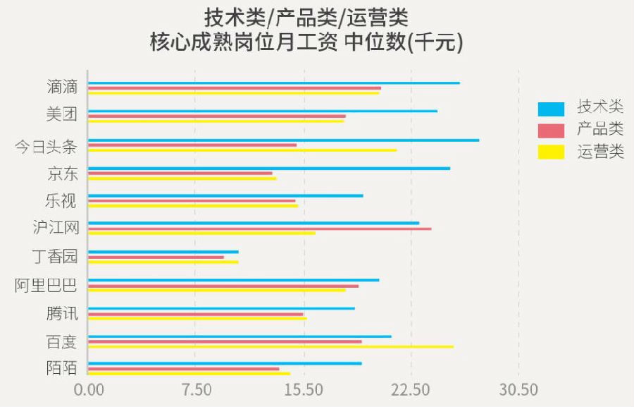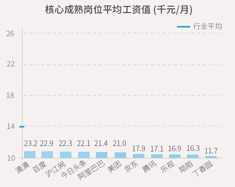 技术类核心岗位中,以数据和算法为核心的今日头条拔得头筹,给出的薪酬水平最高——28。50千元每月,比行业平均水平高出90%。滴滴次之。BAT中,以技术见长的百度,在技术类岗位上开出的薪酬最高(22。08千元每月),但BAT三家均没有进入前五。