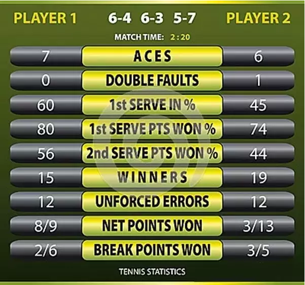 在职业网球的直播信号里,屏幕上会经常出现相关的场上数据,比如说,Ace球数量、发球速度、一发成功率、接发球成功率、上网成功率、得分点等等。密密麻麻的数据很可能已让电视前的球迷眼花缭乱。