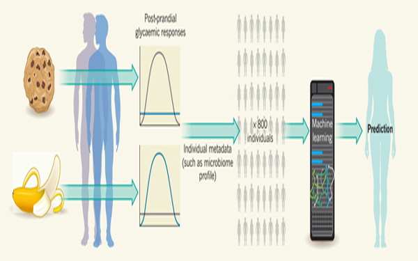 肥胖和Ⅱ型糖尿病正在让发达国家忧愁。一个人的餐后血糖反应(PPGR),是Ⅱ型糖尿病风险的预测。上升得越高,风险越大。因为这个环节,具体指示了一个人是如何能保持血糖控制的。Zeevi等人给 800个人安装了皮下探针,超过一周每五分钟测量他们的血糖水平的过程。除了5107组提供标准化的膳食之外,参与者吃了他们的典型食谱和做了详细的膳食记录。研究包含了52005餐的内容,然后分析了150万多个的葡萄糖测量。