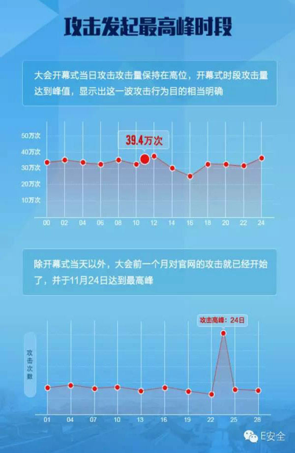 数据显示,世界互联网大会开幕式当日攻击量保持在高位,达到了惊人的39。4万次攻击,而去年首届互联网大会期间则为27万次攻击,这也显示出了这一波攻击行为的目的相当明确。除大会开幕式当天以外,大会前一个月对官网及重要系统的攻击就已经开始,并于11月24日达到最高峰。随着大会圆满落幕,黑客攻击也逐渐趋于平缓。