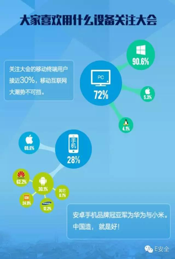 数据显示,关注本届大会的移动终端用户接近30%,华为与小米分获安卓手机品牌冠亚军。许多参会嘉宾也用手机记录会议盛况并通过各种社交App分享到互联网。