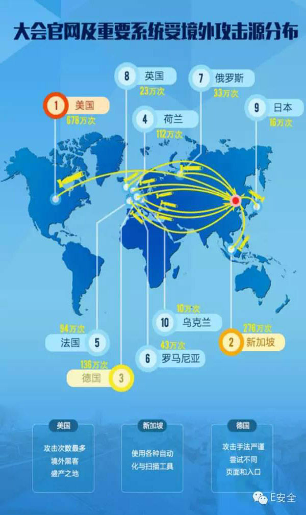 数据显示,大会期间网络安全支持单位安恒信息通过实时监测发现大量可疑攻击源来自于63个国家,其中美国总共发起678万次攻击、新加坡总共发起276万次攻击、德国总共发起135万次攻击。