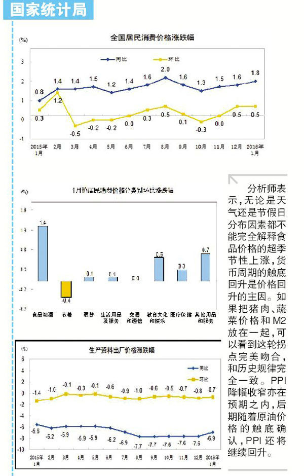 国家统计局发布消息:2016年1月份,全国居民消费价格总水平同比上涨1.8%,全国工业生产者出厂价格环比下降0.5%,同比下降5.3%