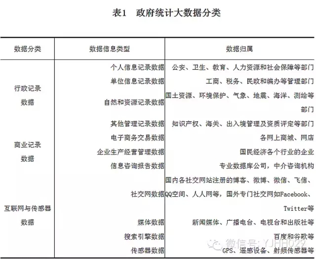 这可以从大数据的分类上进一步阐释。如果从数据产生主体的角度来分,在马建堂(2013,2015)研究的基础上,将目前可应用于政府统计的大数据,归为行政记录数据、商业记录数据、互联网与传感器数据三大类,如表1所示。