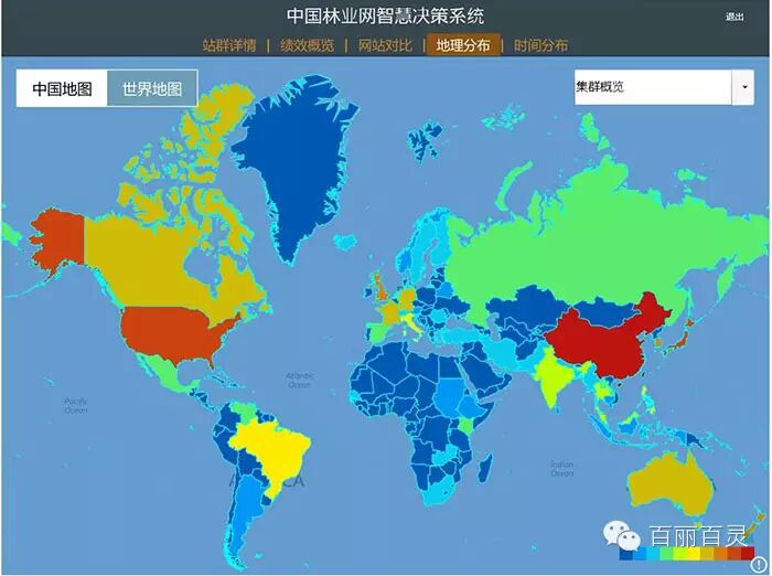 "地理分布"模块以地图的形式直观地展现了中国林业网站群访问用户的地域分布情况,通过点击界面左侧的"中国地图"、"世界地图"按钮来分别查看中国林业站群网站用户地理来源的国内和国际分布情况。