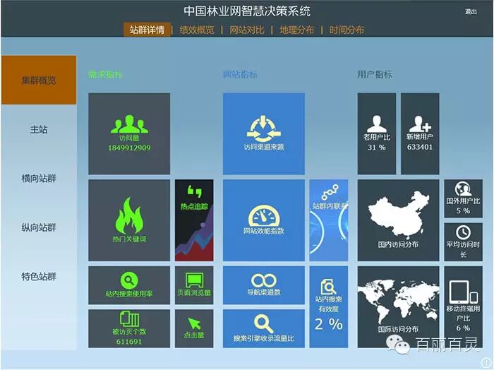 中国林业网智慧决策系统包括站群详情、绩效概览、网站对比、地理分布、时间分布等5个功能模块。"站群详情"功能模块从集群概览、主站、纵向站群、横向站群、特色站群等5个角度,根据热门关键词、页面浏览量、站内搜索使用率、访问量、国内外访问分布、移动终端用户比、网站效能指数、站内搜索有效度、站群内联系等22个指标,对中国林业网站群用户访问数据进行集中展现。