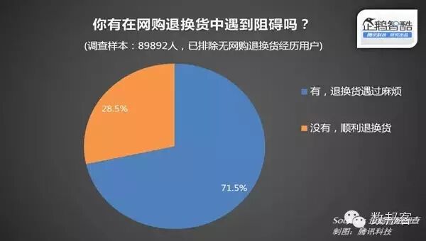 在精准筛选出有过网购退换货经历的用户群体后,我们发现,其中很顺利完成退换货的消费者占比只有28.5%,而遇到过麻烦,甚至无法完成退换货的用户占比高达七成。