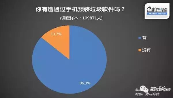 企鹅智酷针对手机预装垃圾软件的调查,结果同样令人震惊。86.3%的用户表示,自己遭遇过手机预装垃圾软件的烦恼,这一比例高于我们的预期。