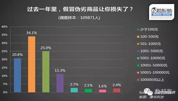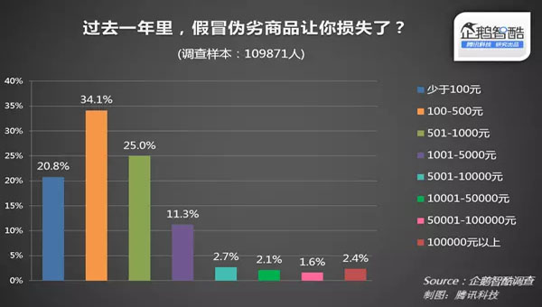 在此次企鹅智酷“网上315”调查中,我们还关注另一个重点,即假货和各种消费欺诈行为,在过去一年中给中国消费者带来了多大程度的经济损失。