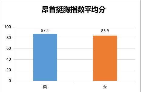 从平均得分来看,参与调查的男性抬头挺胸指数为87.4分,而女性仅为83.9分。可见在高强度的工作状态下,女性的颈腰椎健康状况很可能会先亮起“红灯”。