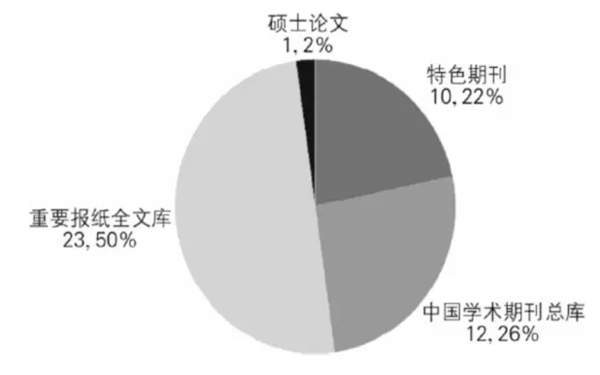 CNKI数据库中以“大数据风控”为主题的文献共46篇。在这些文献中,以报道性的文章较多,重要报纸全文库和特色期刊总共为33篇,占比72%;而理论研究的文章较少,中国学术期刊总库为12篇,占比26%;尚没有CSSCI2014—2015年的来源期刊(如图1)。